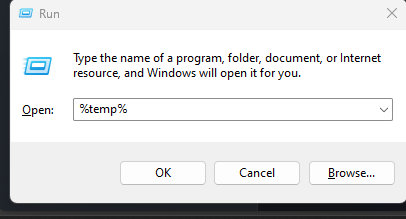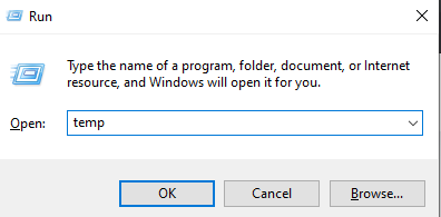 Lalu lakukan lagi, Klik **Start Win + R** lalu ketik **`%temp%`** seperti gambar
