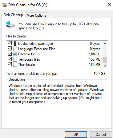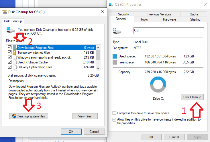 **Klik kanan Local Disk C** lalu **Properties** lalu klik **Disk Cleanup** lalu checklist semua file pada no.2 lalu **Clean up system files**