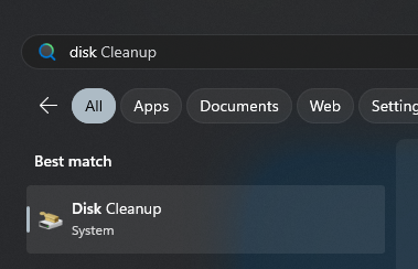 Cari **`Disk Cleanup`** pada start menu, seperti dibawah ini